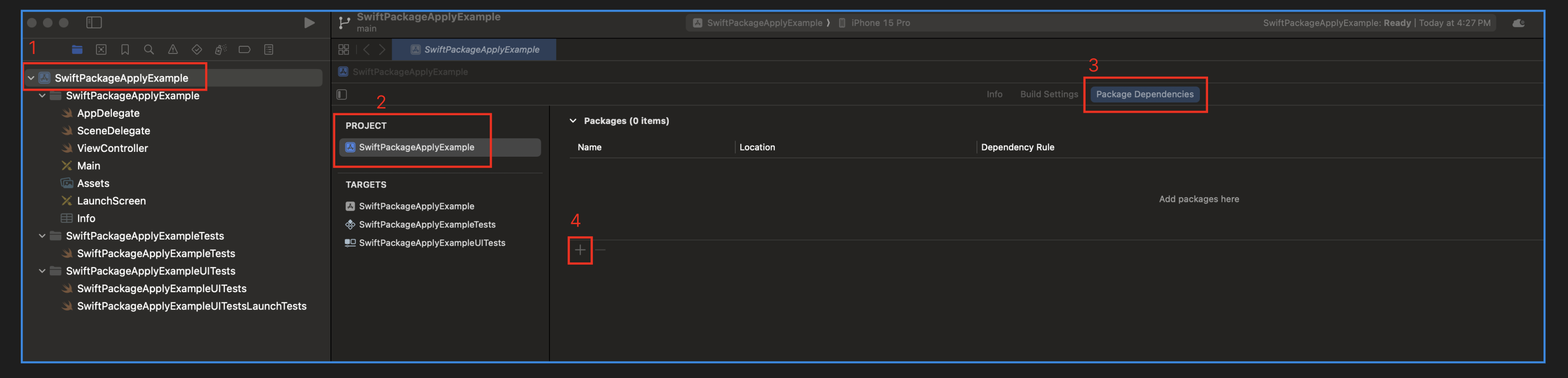 Xcode에서 프로젝트를 열고, 'File' > 'Swift Packages' > 'Add Package Dependency...'를 선택