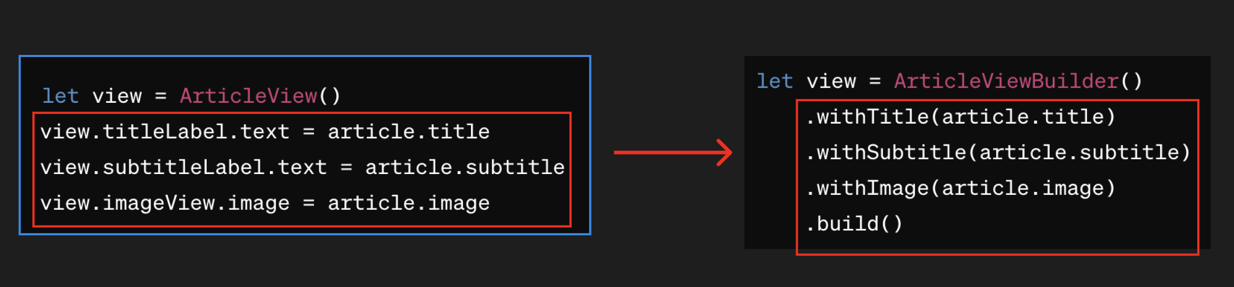 위와 같은 방식으로, ArticleView의 모든 설정이 빌더 내에서 이루어지며, 완성된 뷰 객체는 설정이 끝난 후에만 접근할 수 있다.