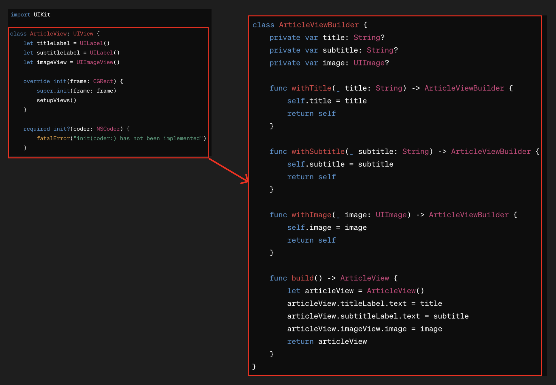 위와 같은 방식으로, ArticleView의 모든 설정이 빌더 내에서 이루어지며, 완성된 뷰 객체는 설정이 끝난 후에만 접근할 수 있다.