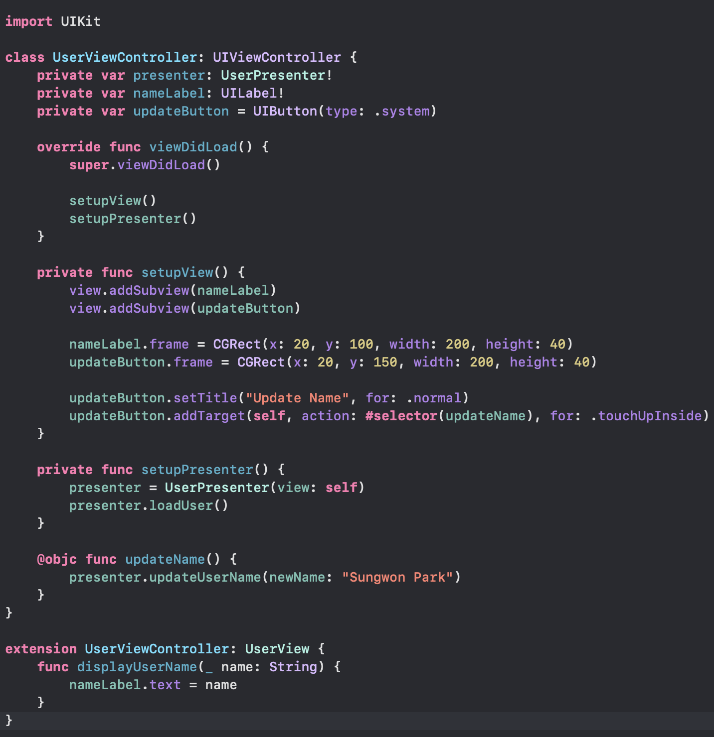 - View 갱신: Presenter는 이 데이터를 바탕으로 ViewProtocol의 인터페이스를 통해 View를 업데이트합니다